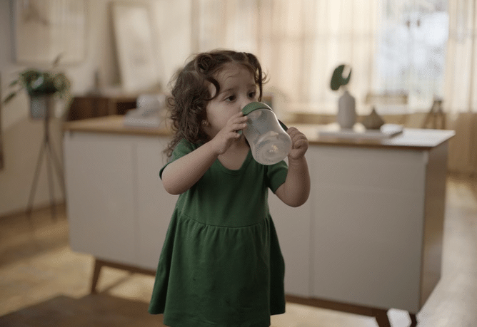 During the shoot, they decided to film the scene of the girl drinking milk without any milk in the bottle. The work involved tracking, modeling the bottle, and simulating the milk to composite it in post.
